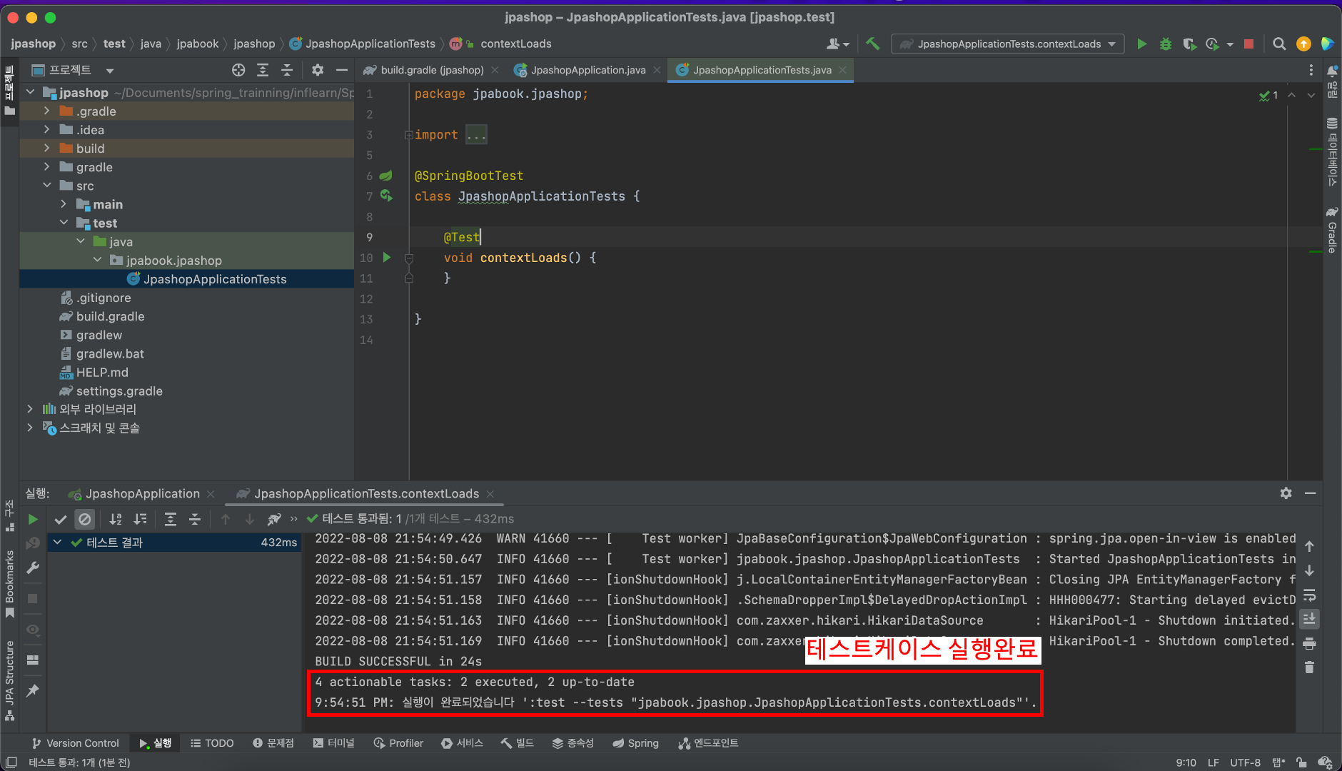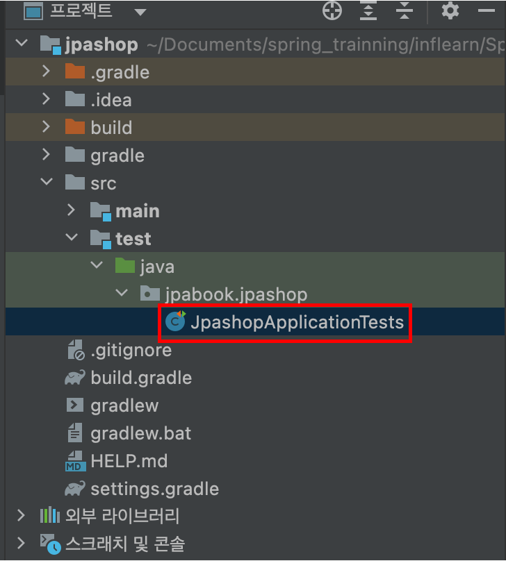 아래 사진과 같이 프로젝트 탐색창에서 JpashopApplicationTests.java를 연다