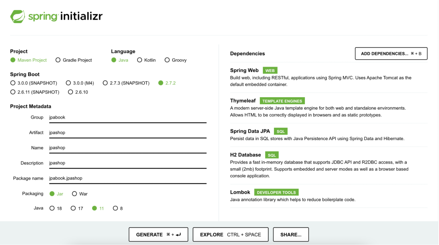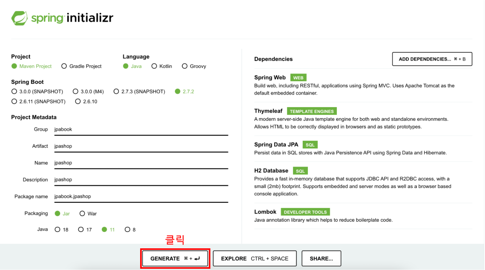 위와 같이 Dependencies 추가 후 아래 사진의 Generate 버튼을 누른다