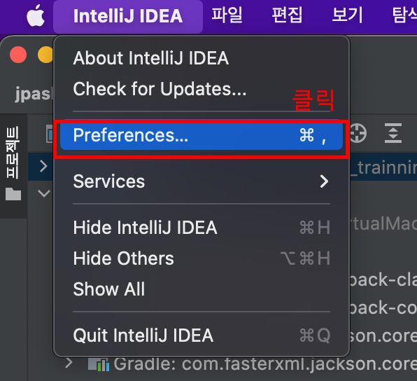 상단 메뉴 바의 Preferences를 클릭한다