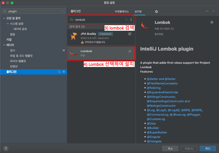 먼저 IntelliJ의 Lombok 플러그인을 설치하겠다