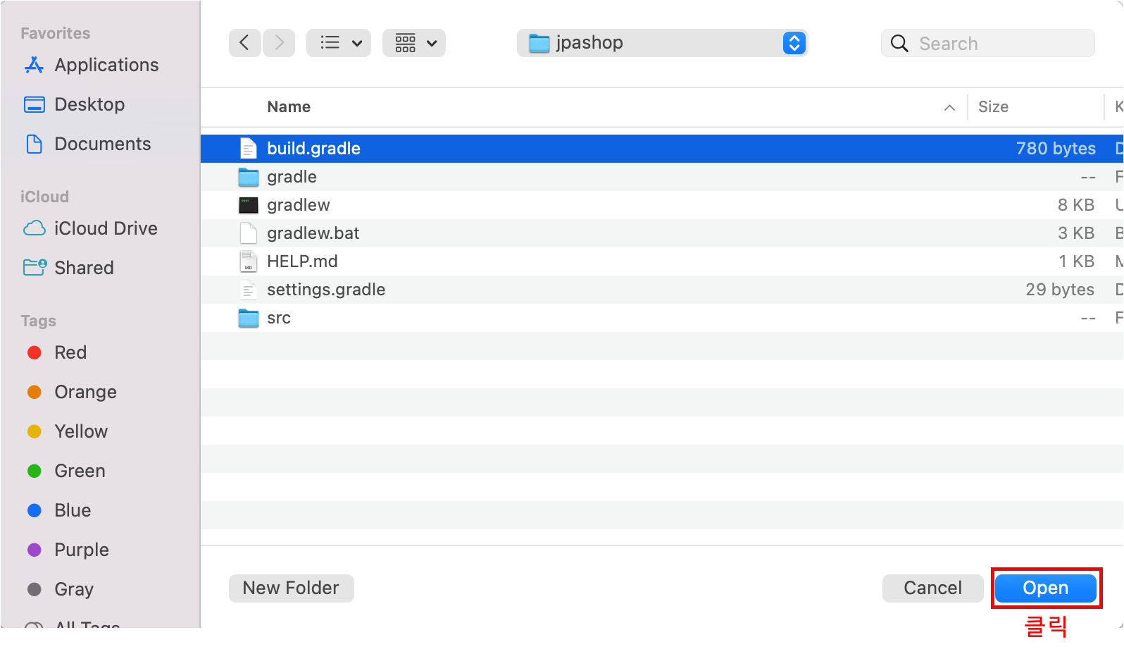프로젝트 폴더 내의 build.gradle을 선택 후 open(열기)를 클릭한다
