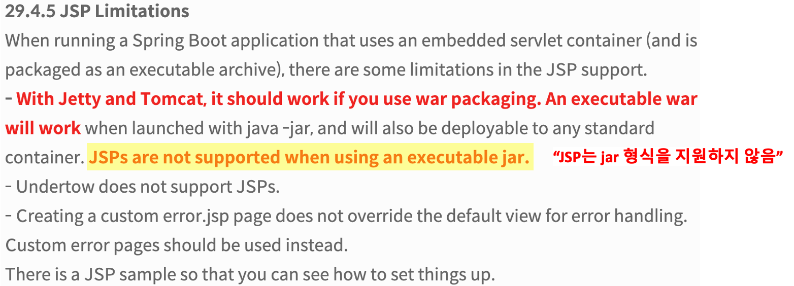아래는 Spring Boot Docs에 명시된 Spring Boot + JSP 사용 시 제약사항이다