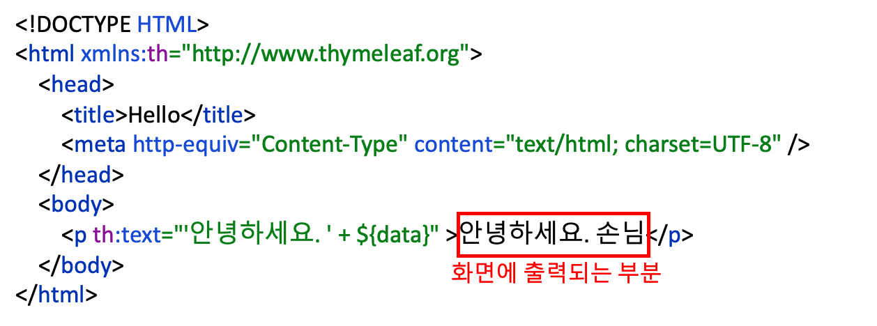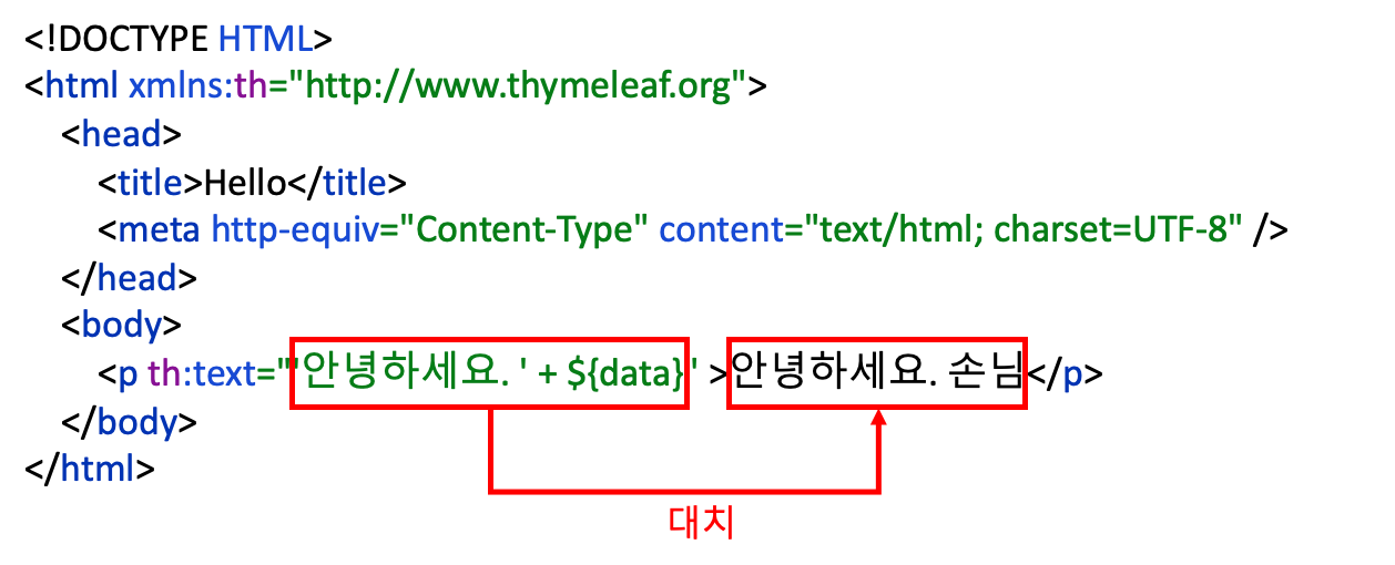 <p th:text="'안녕하세요. ' + ${data}" >안녕하세요. 손님</p>