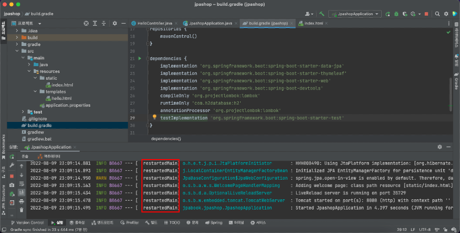 콘솔 창에 'restartedMain'이라는 글자가 떠야 정상적으로 적용된 것이다
