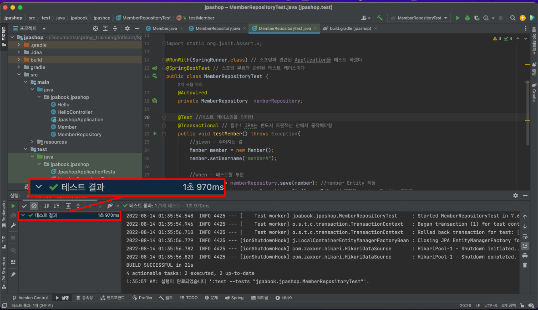 Member findMember=memberRepository.find(savedId); // 저장한 member Entity 가져옴