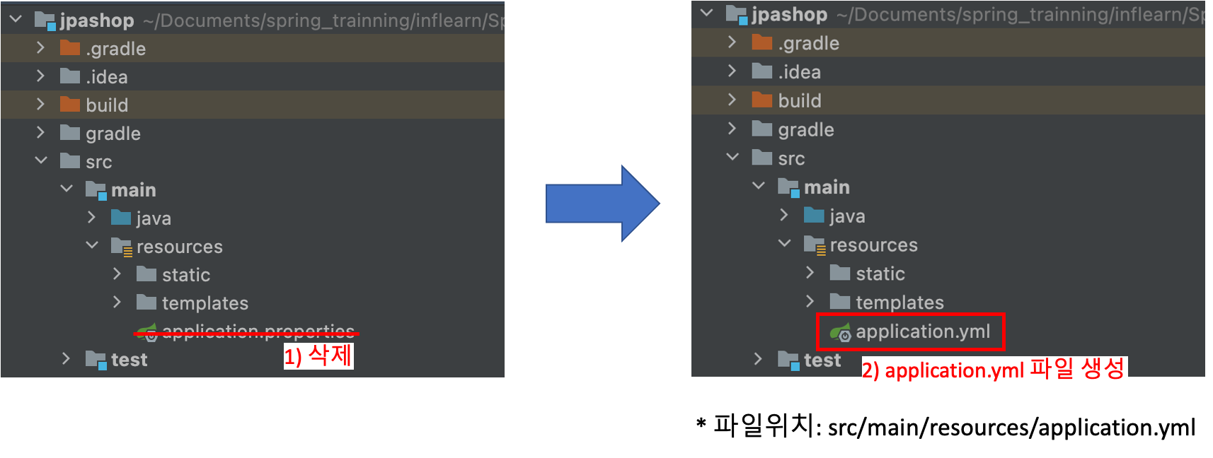 아래와 같이 'application.properties' 파일을 지우고 'application.yml'파일을 생성한다