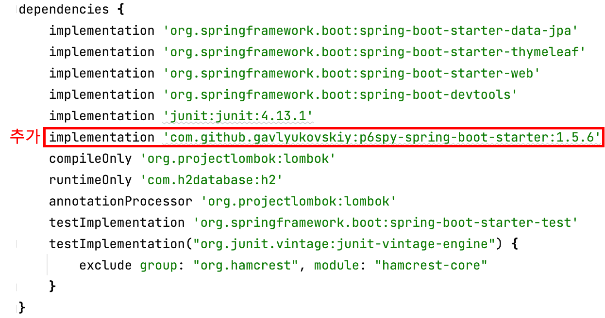 implementation 'com.github.gavlyukovskiy:p6spy-spring-boot-starter:1.5.6'