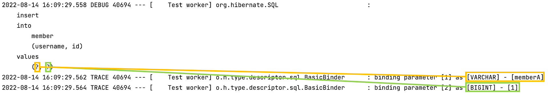 P6Spy을 사용할 경우, "org.hibernate.type" 설정할 때보다 훨씬 가독성이 향상된 것을 볼 수 있다