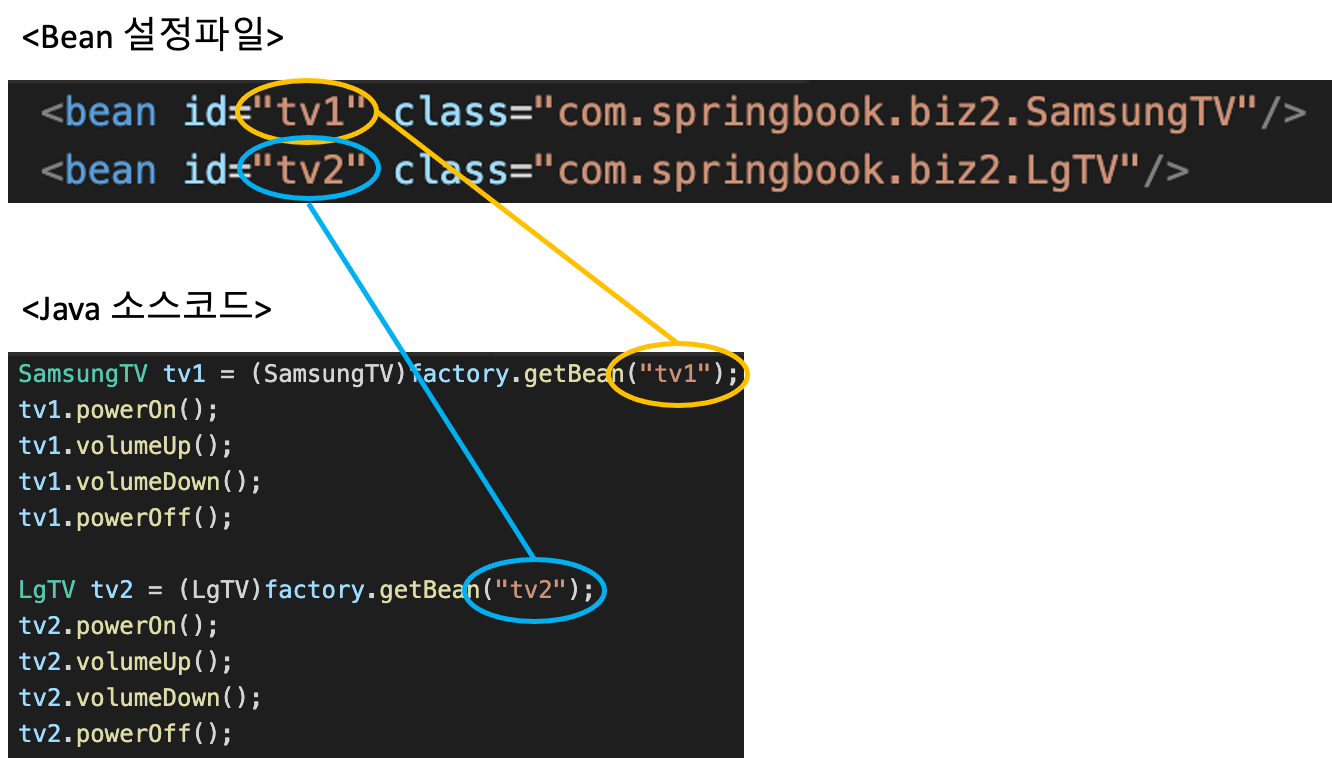 Bean 설정파일에 있는 Bean의 id를 이용하여 getBean 메소드로 IoC 컨테이너에게 요청하여 객체를 받아오는 모습을 볼 수 있다.