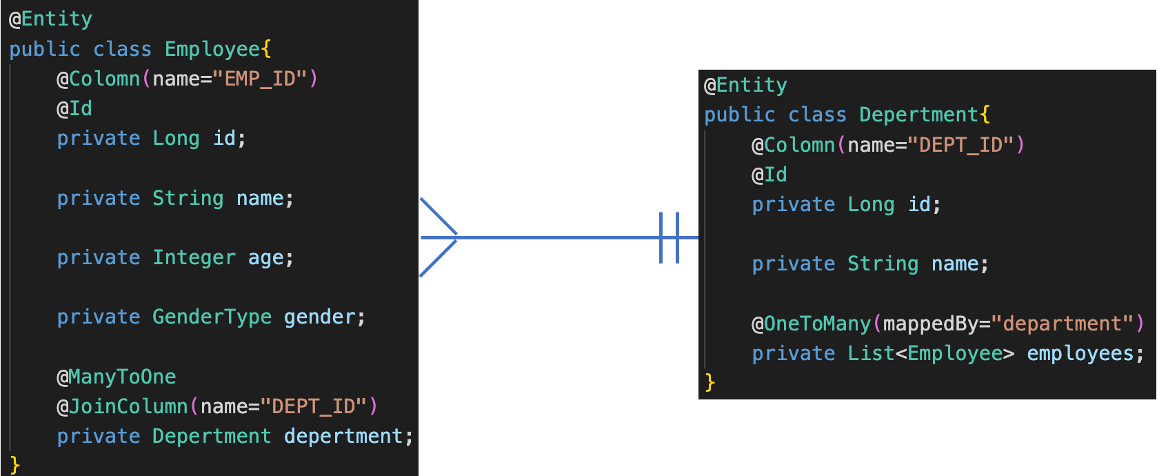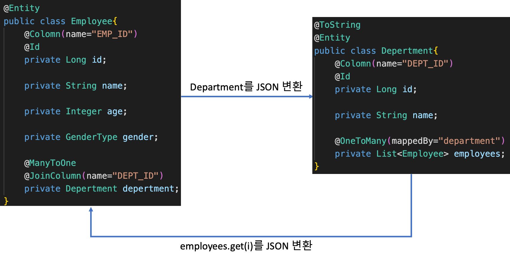 이를 위해 아래와 같이 Employee와 Department 양쪽에 참조값을 넣어줘야 한다