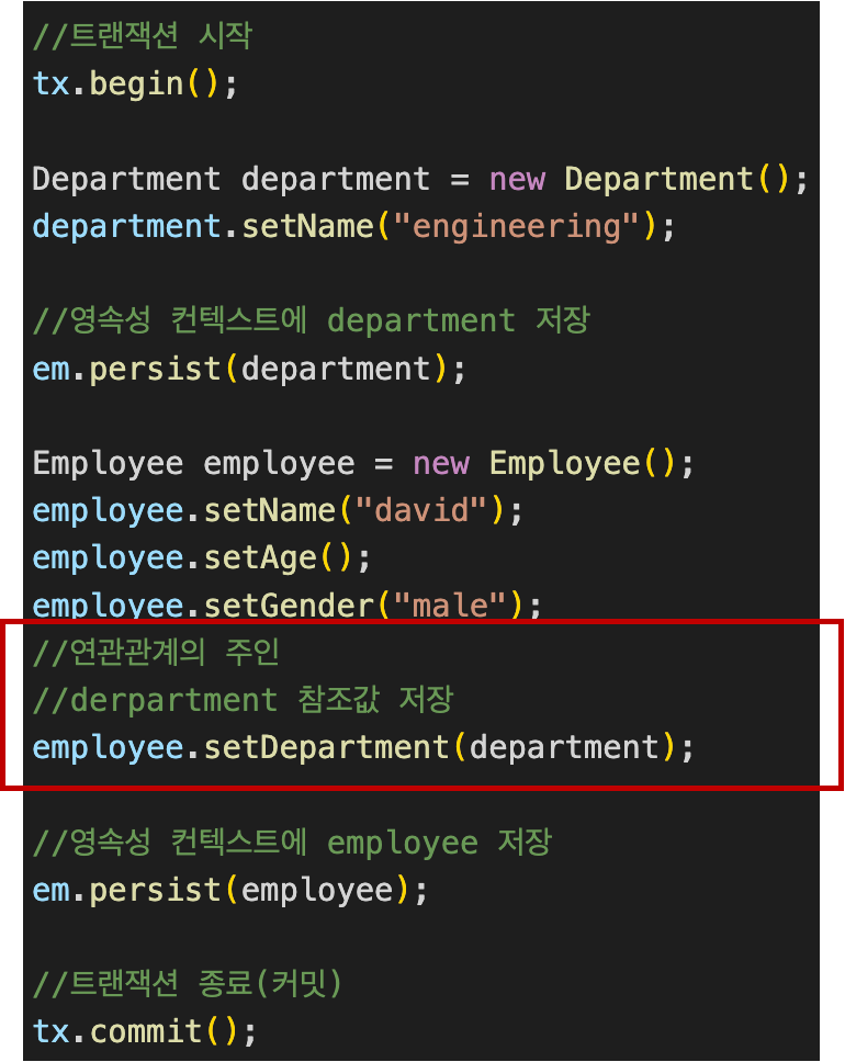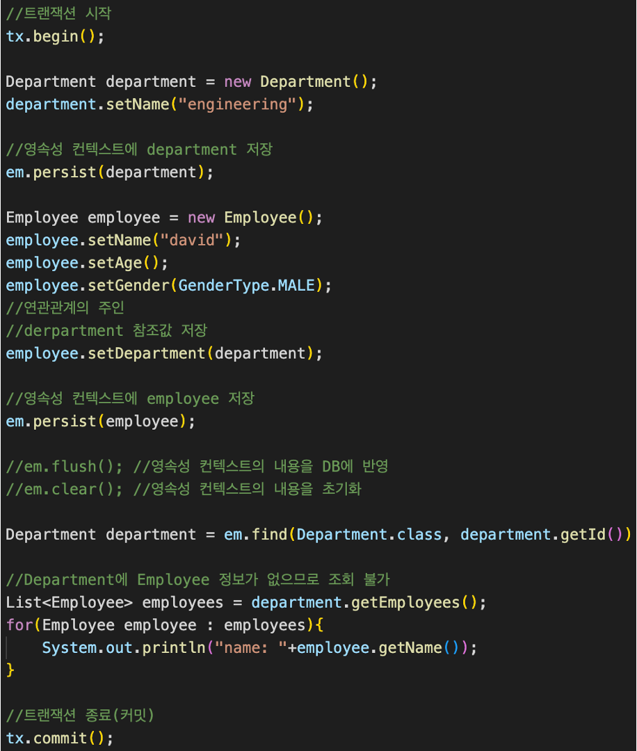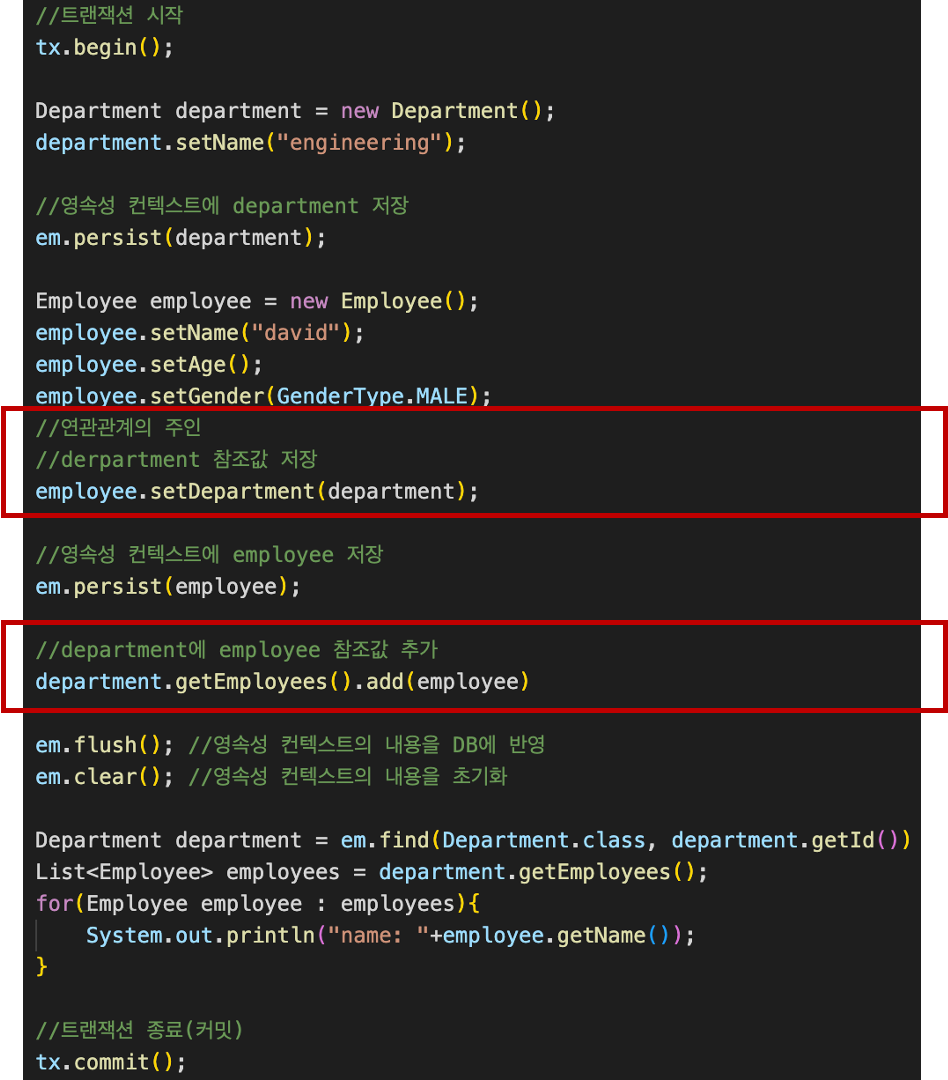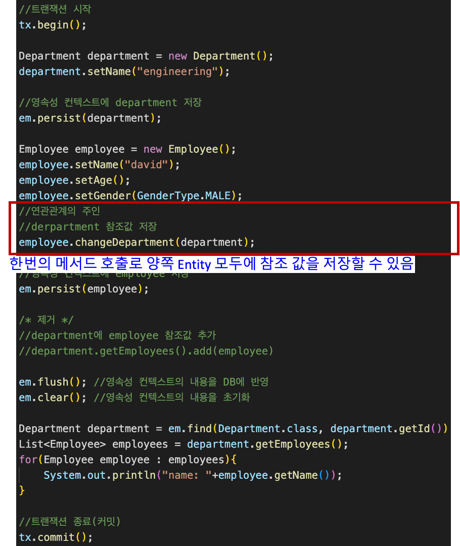 - 위 코드에서 department.getEployees().add(employee)와 같은 코드는 개발자의 실수가 발생할 수 있다(누락, 오타 등)