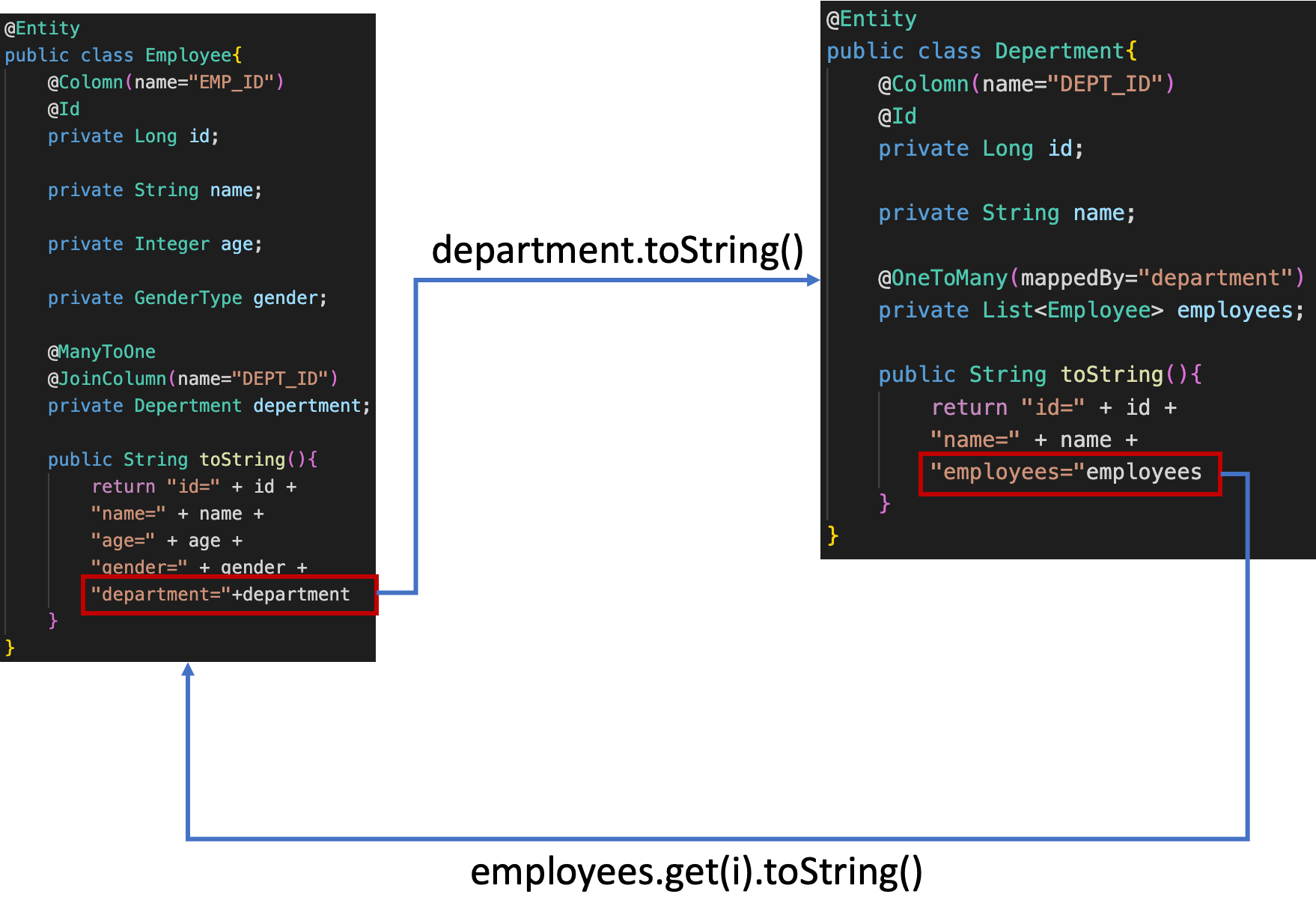 - Entity안에 다른 Entity가 속성으로 있을 경우 연관관계에 있는 엔티티의 toString 메소드가 순환참조되어 무한호출됨