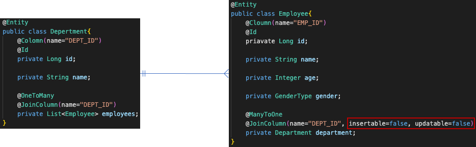 3. Employee의 department위에 JoinColum 어노테이션을 추가 및 연관관계 주인(emplpyees) 지정