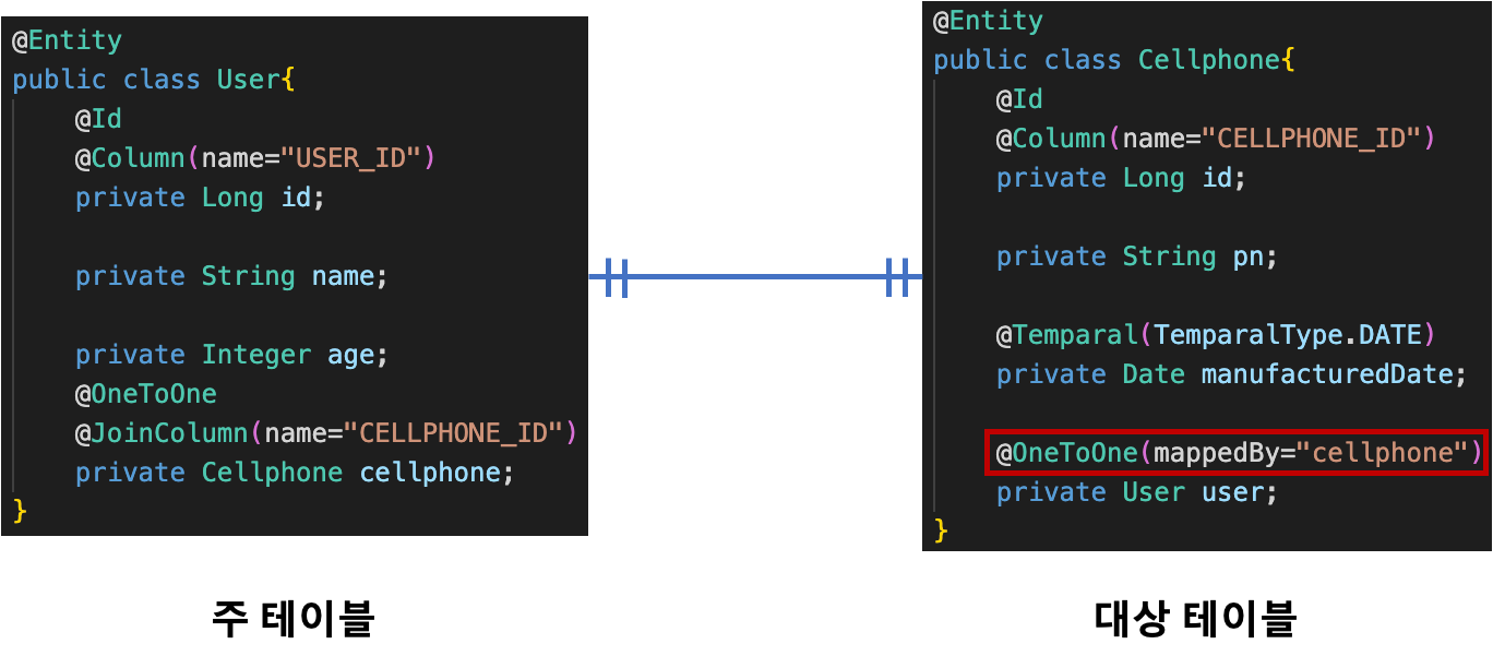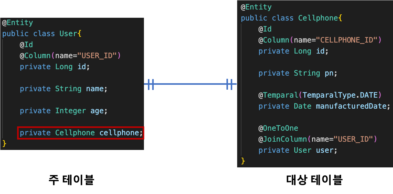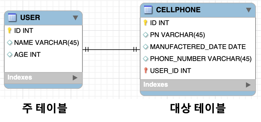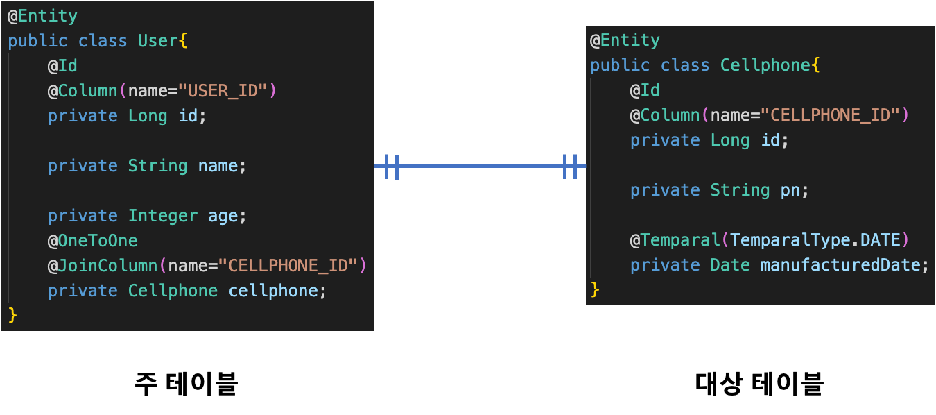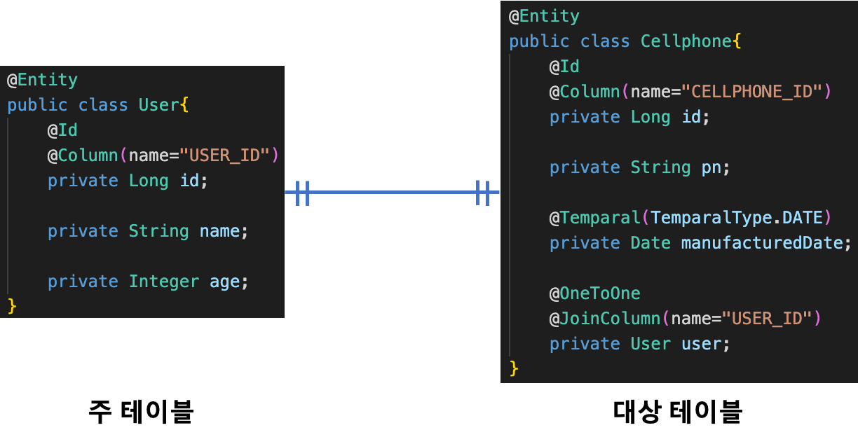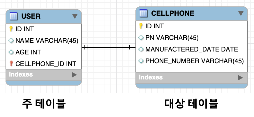 그럴 경우, 사용자와 휴대전화 관계는 다음과 같이 DB와 Entity에서 1:1 관계로 표현될 수 있다