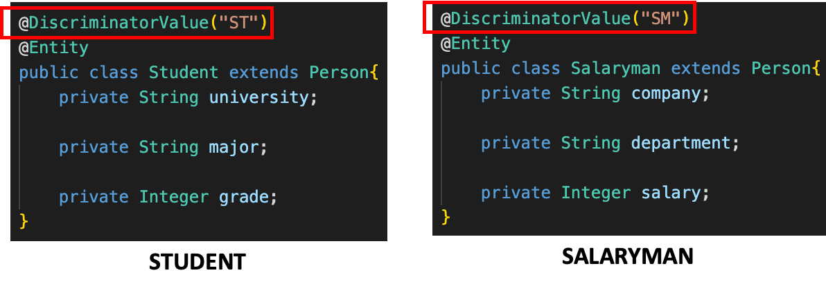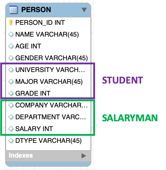 - 자식 테이블(STUDENT, SALARYMAN)의 컬럼이 부모 테이블(PERSON)에 포함된 구조