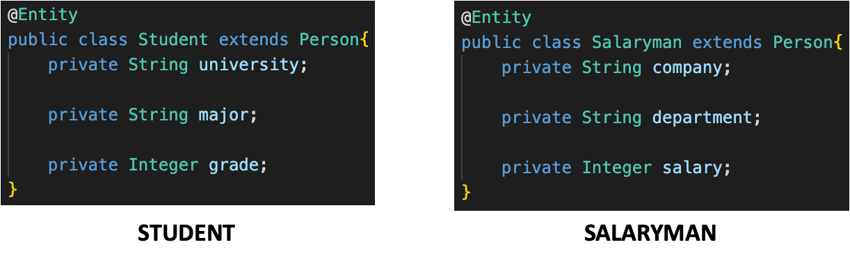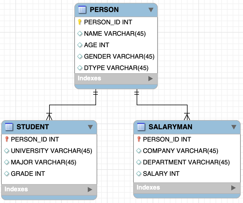 - 부모 테이블(PERSON)의 컬럼이 자식 테이블(STUDENT, SALARYMAN)에 포함된 구조