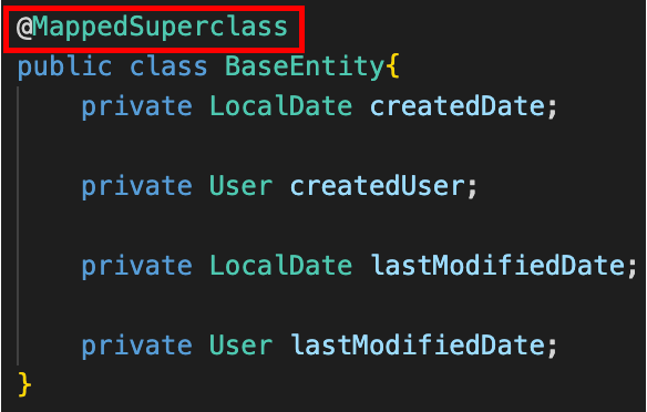 이를 위해, JPA에서는 @MappedSuperClass 어노테이션을 제공한다