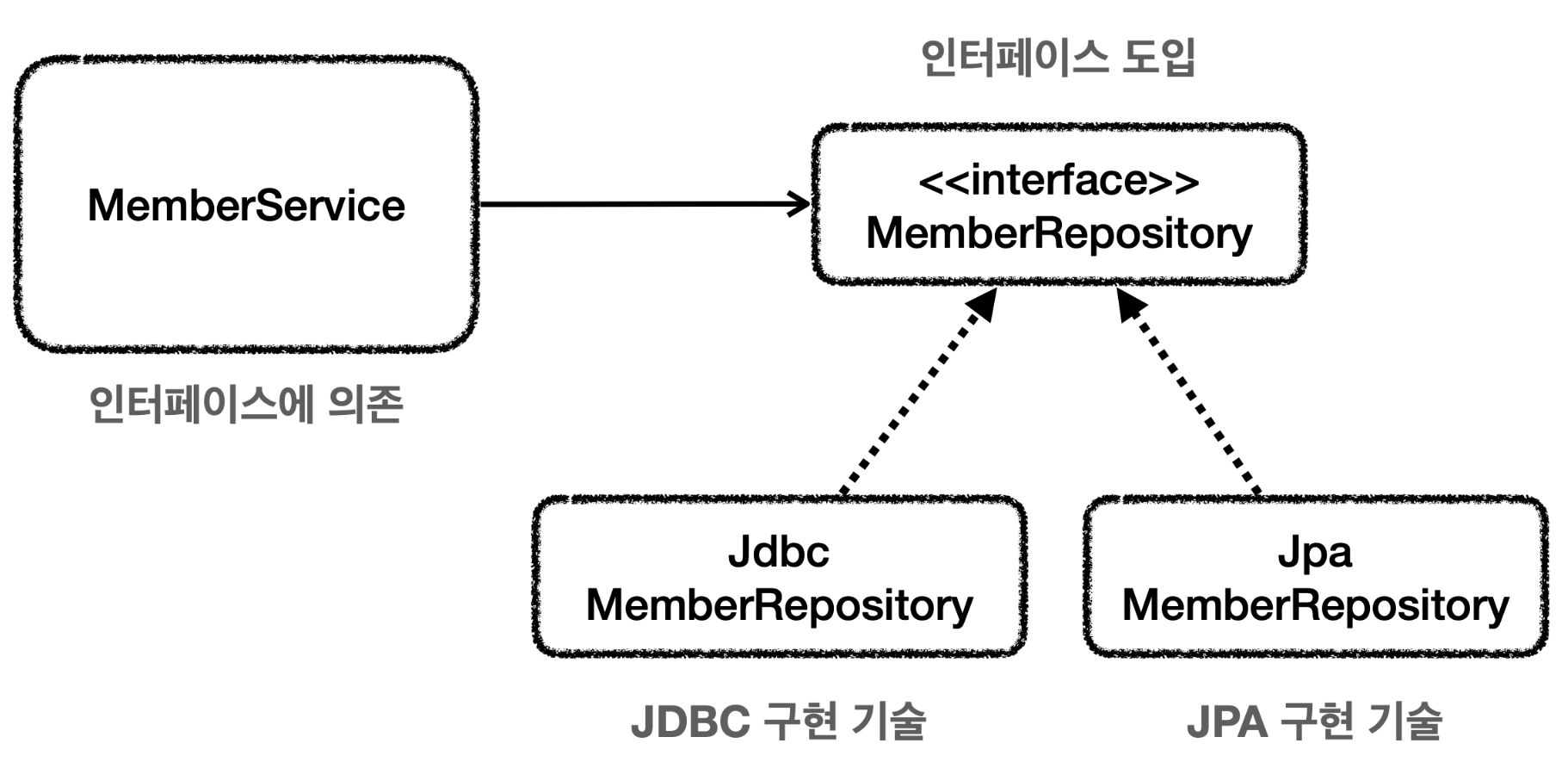 그러므로, JDBC Template에서 JPA로 기술을 전환할 때, 해당 인터페이스를 구현한 모든 구현체의 소스코드를 수정해야한다.